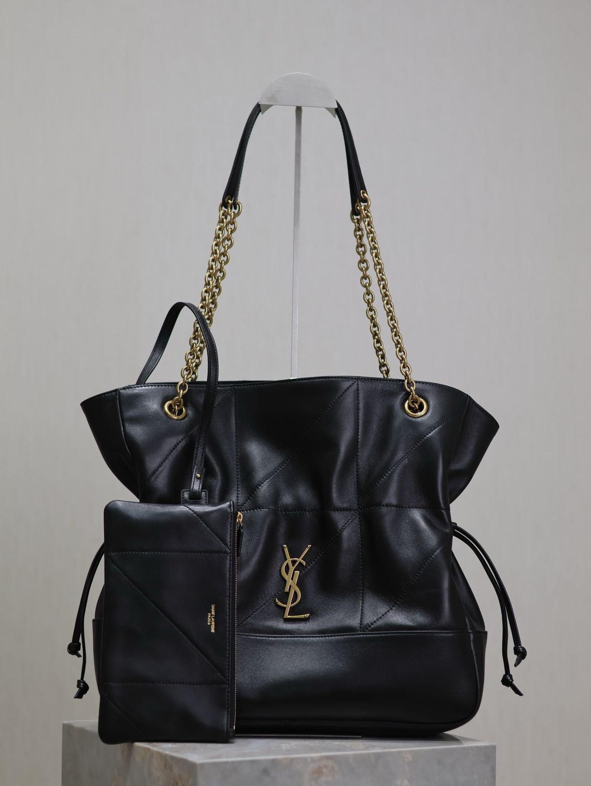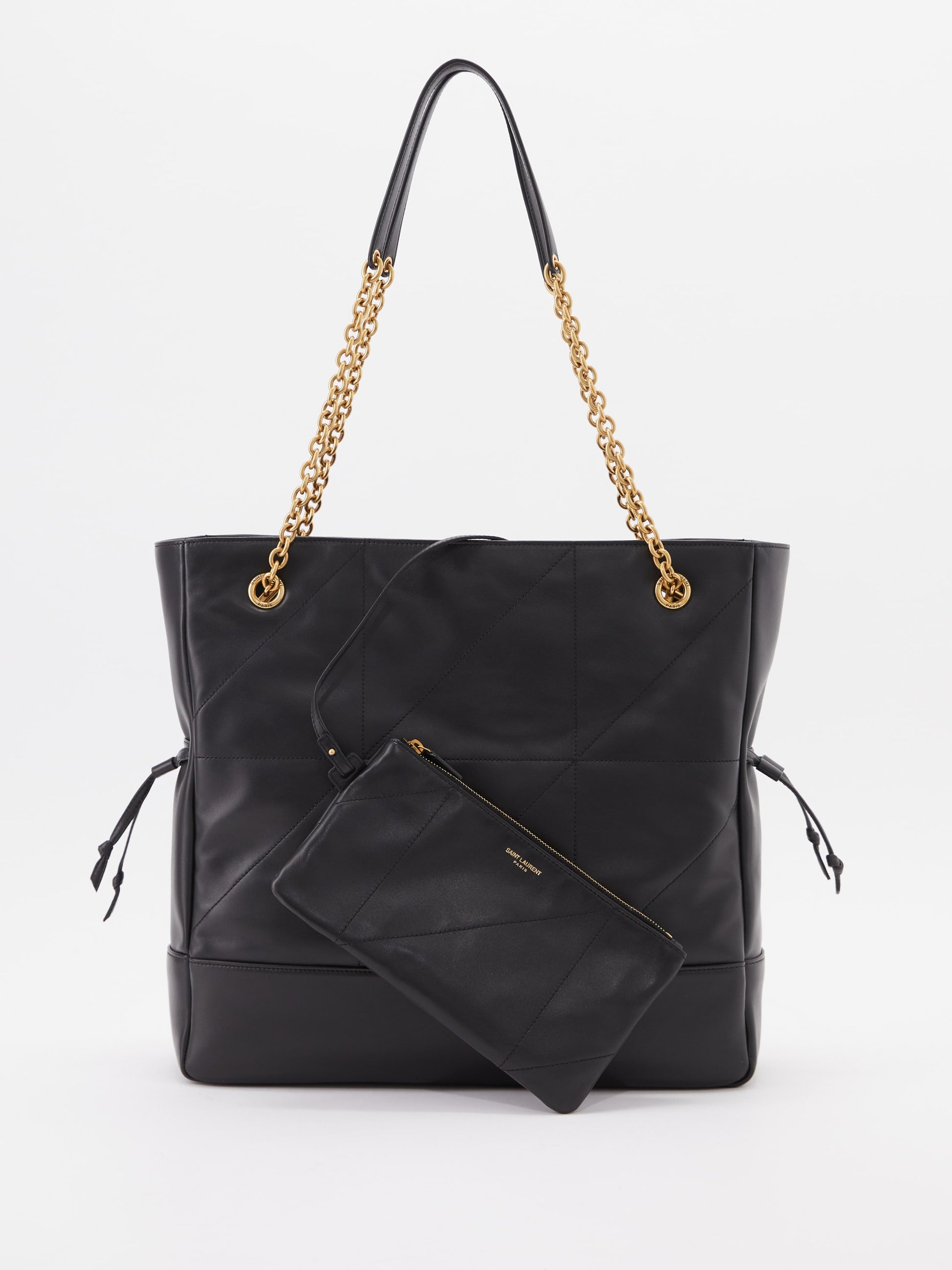 Designer color name: Noir. Item color: black. Chain and leather shoulder strap. Closure: snap-clasp fastening. Detachable pouch. Hardware color: gold. Internal details: internal zipped pocket. Leather.