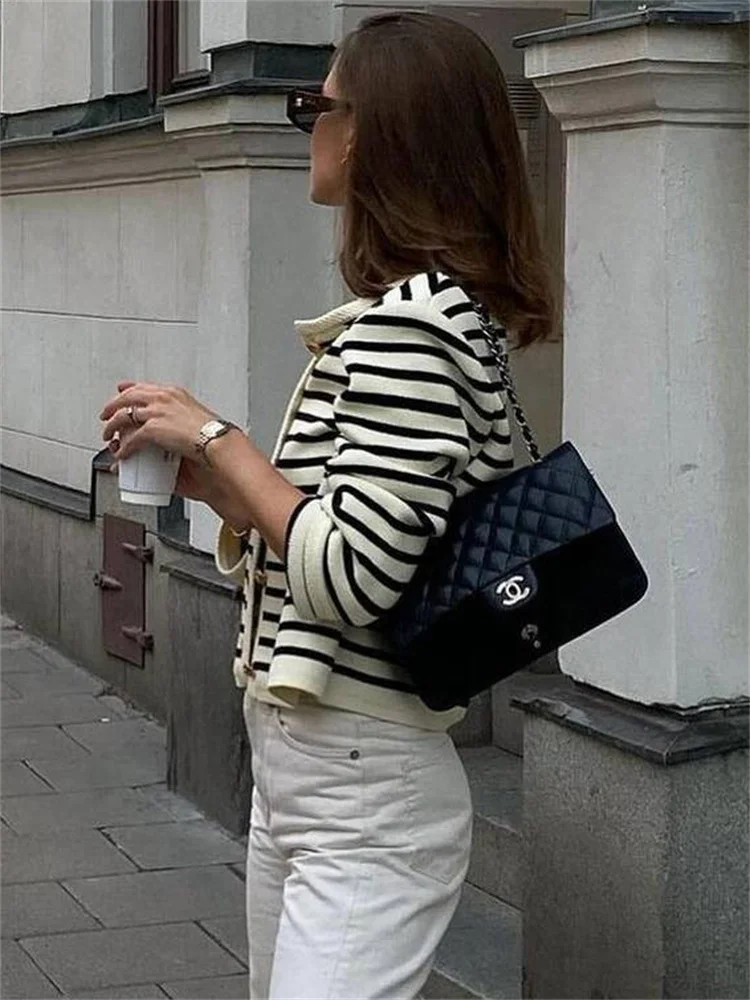 Discover the Elegant Women’s Cardigan, an essential piece that combines comfort and sophistication. Crafted from soft, high-quality knit, it wraps you in warmth while adding a chic touch to your outfit. Its timeless striped pattern and back button closure provide exceptional versatility: wear it open for a casual look or buttoned up for a more refined appearance.